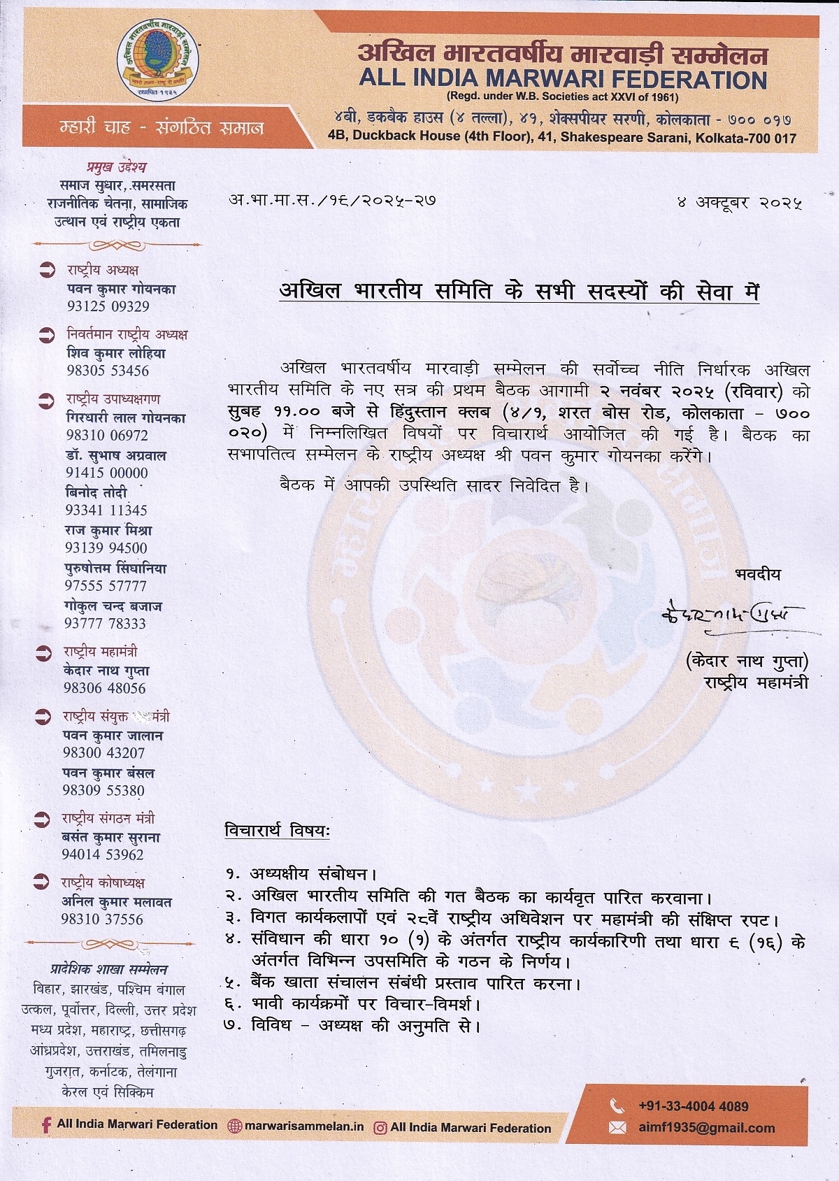 The 1st All India Committee Meeting of current session will be held on 02 November 2025 at 11.00 AM at Hindusthan Club, 4/1, Sarat Bose Road, Kolkata-700020.